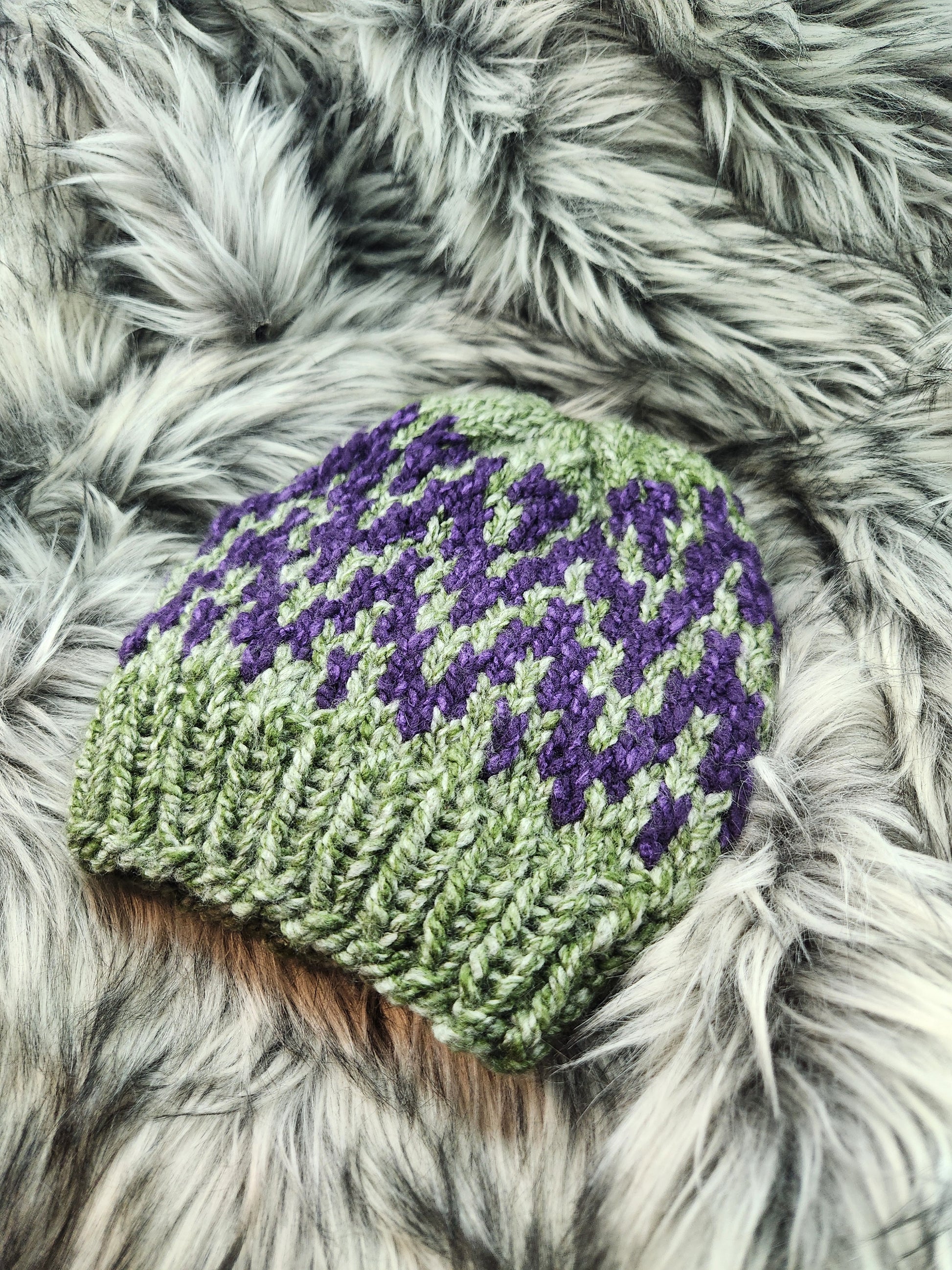 Hand-made acrylic heather green w/ heather dark purple striped hat is the perfect addition to your winter wardrobe. Crafted from bulky weight soft acrylic material, it will keep you warm and feeling stylish. The hand-knit design adds a touch of uniqueness to this must-have accessory.
