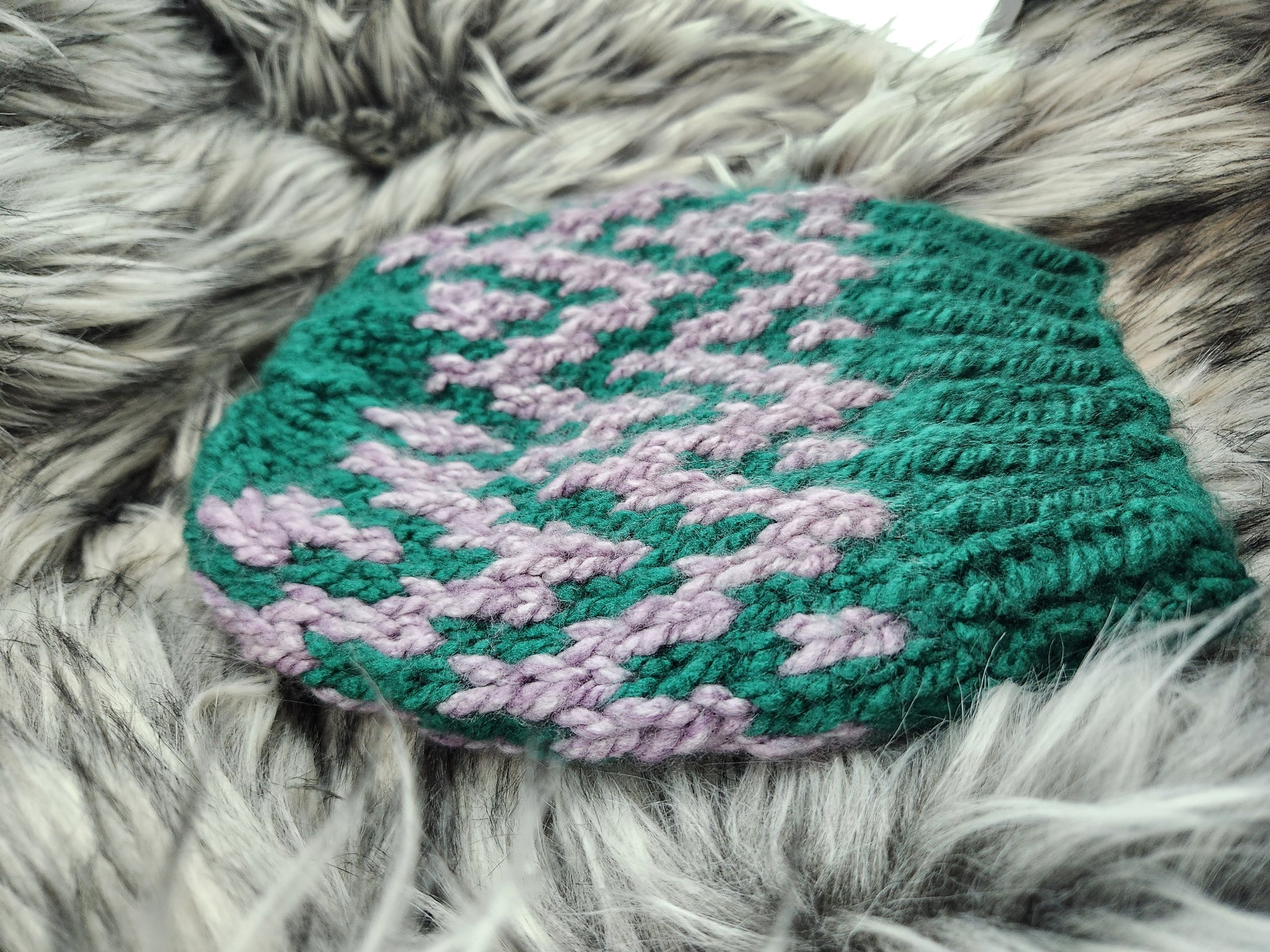 Hand-made acrylic christmas green w/ heathered light purple striped hat is the perfect addition to your winter wardrobe. Crafted from bulky weight soft acrylic material, it will keep you warm and feeling stylish. The hand-knit design adds a touch of uniqueness to this must-have accessory.