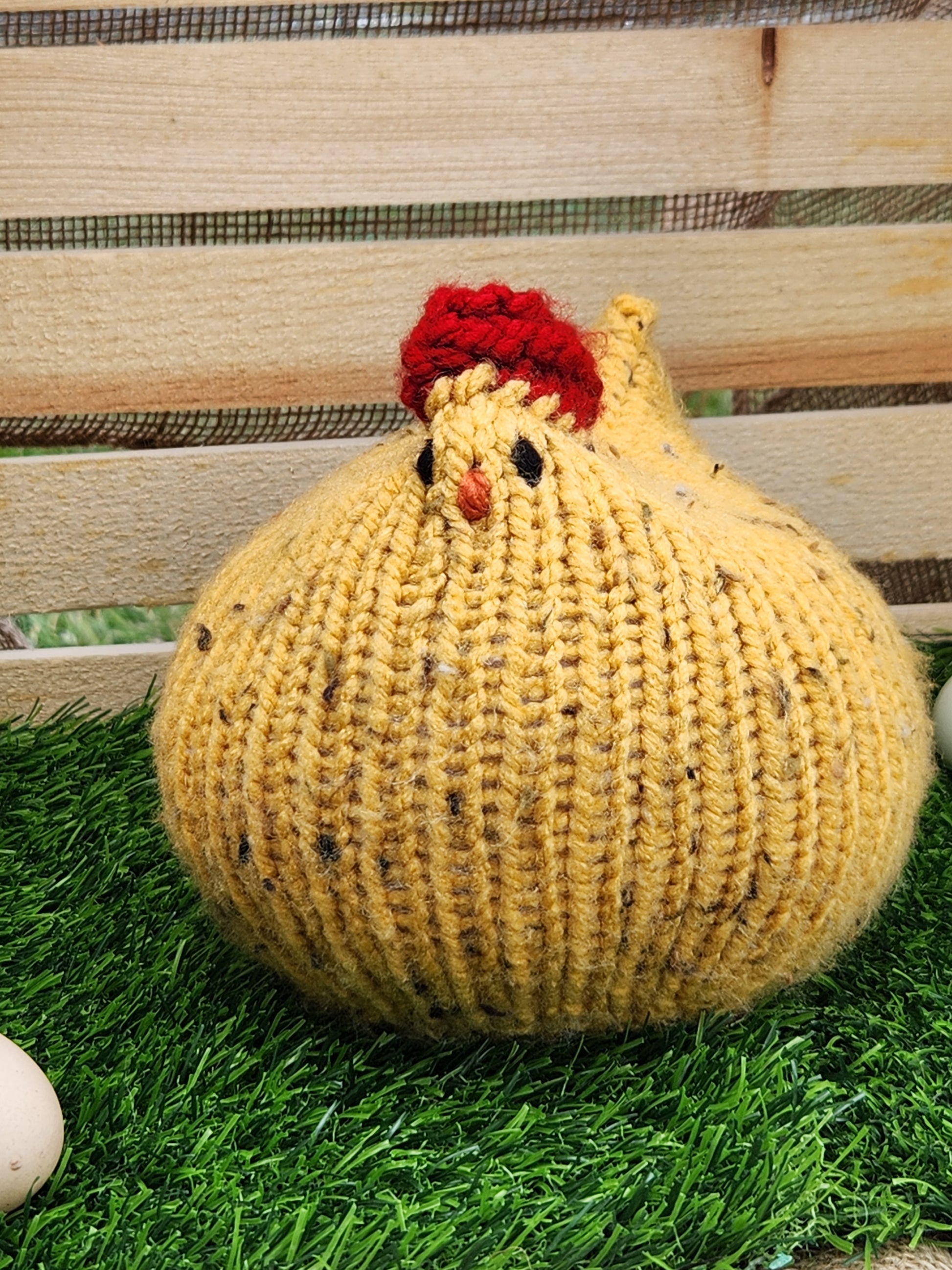 This hand knit yellow tweed chicken plushie is perfect for adding a touch of whimsy to any room. Its soft, handmade design makes it ideal for cuddling or displaying as a unique piece of decor. Made with care, this chicken is sure to bring joy and charm to any space.