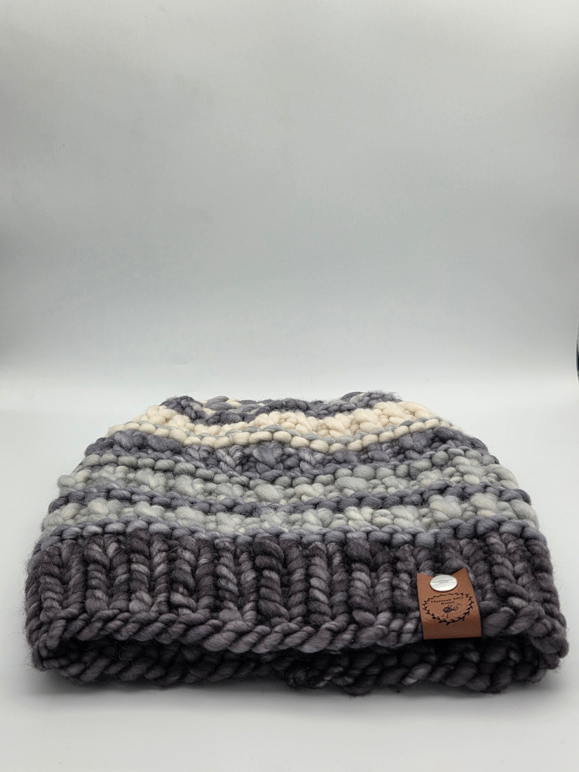 100% Merino wool with a faux tag and rivet