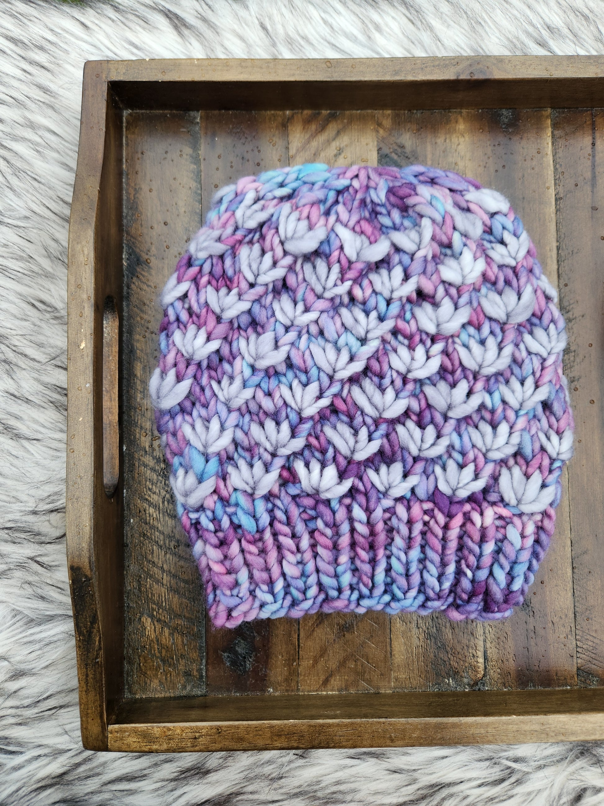 Pattern is the "Lotus flower hat" by Bkknitshandmade