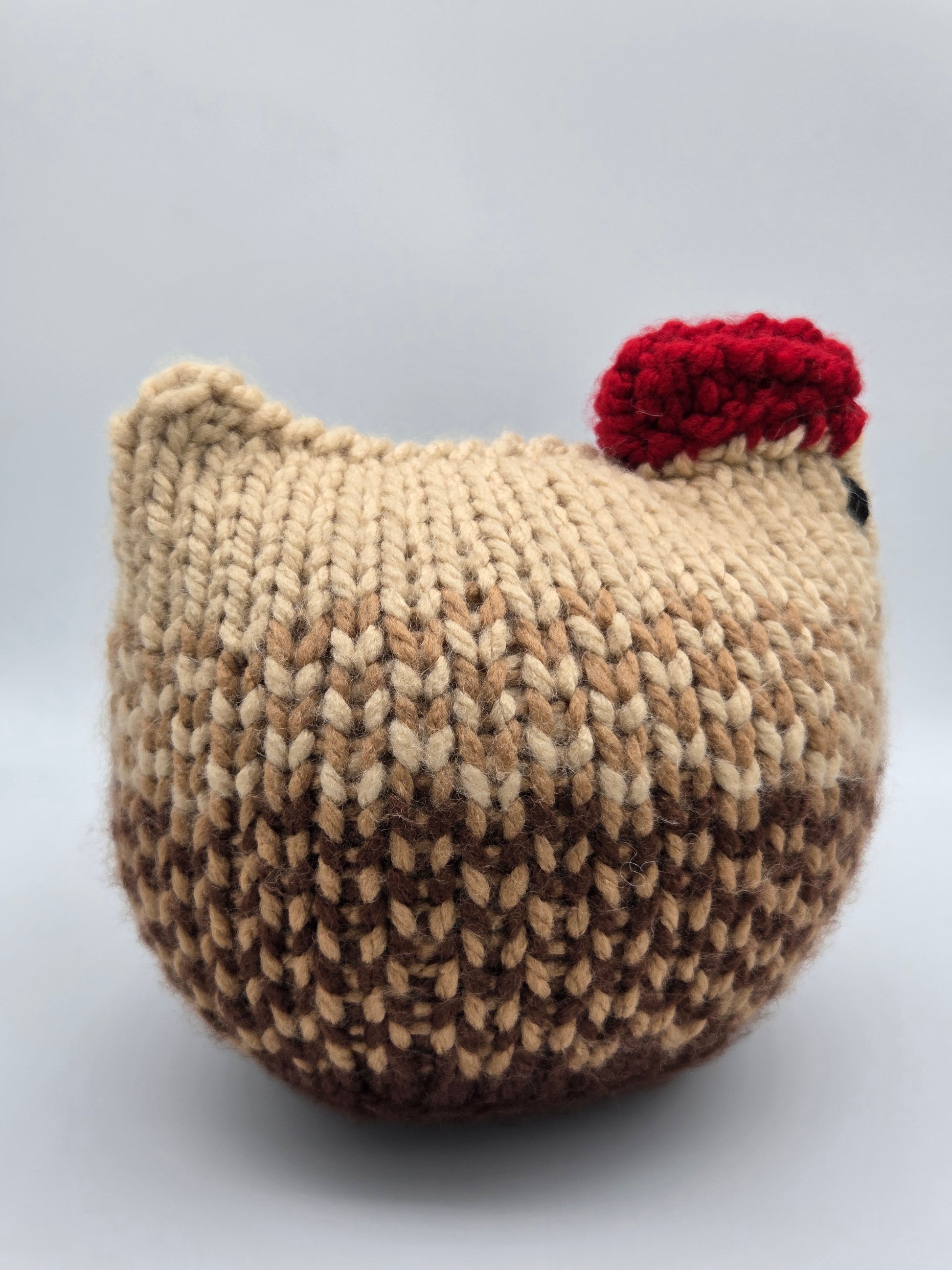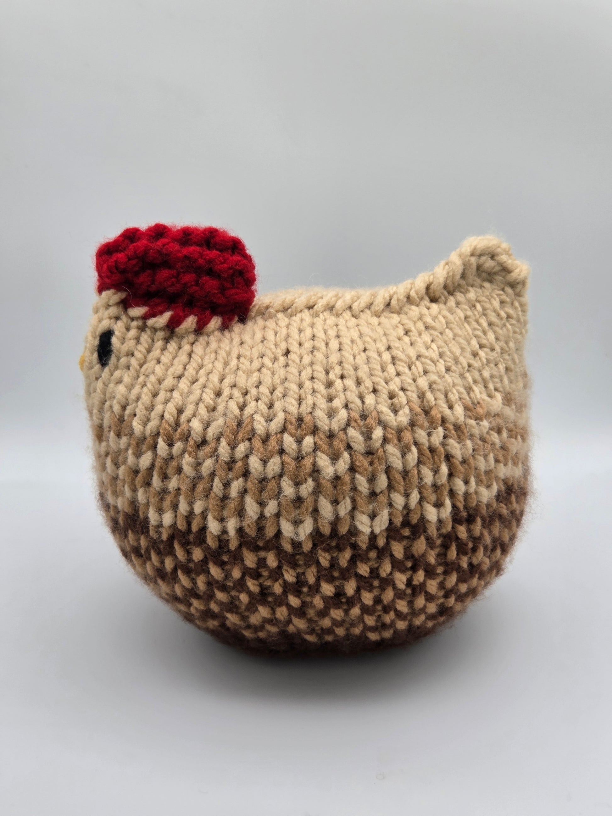 Meet your new feathery friend: a medium chicken hand-knit in 3 different browns! This little clucker is perfect for adding a touch of whimsy to any nook. It won’t lay eggs, but it sure will yolk around and crack you up (pun intended)! Get ready for some serious poultry charm!