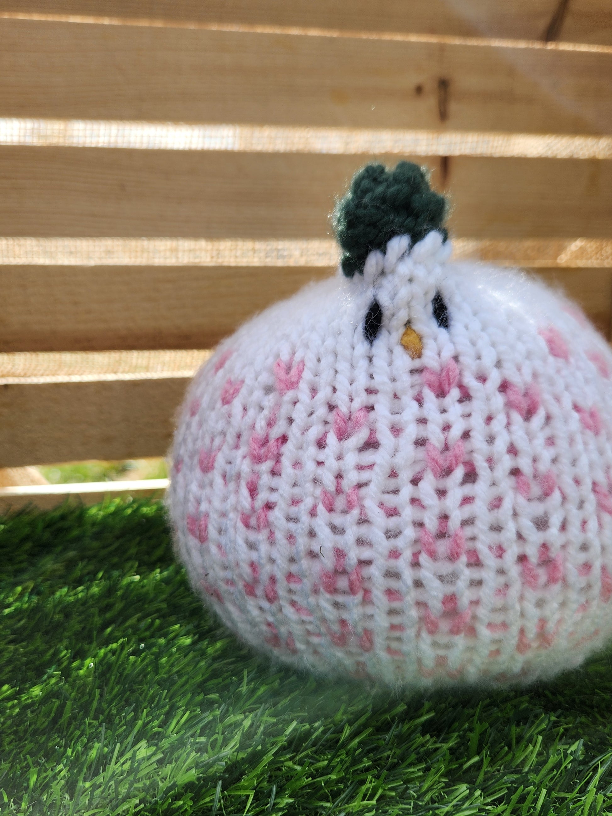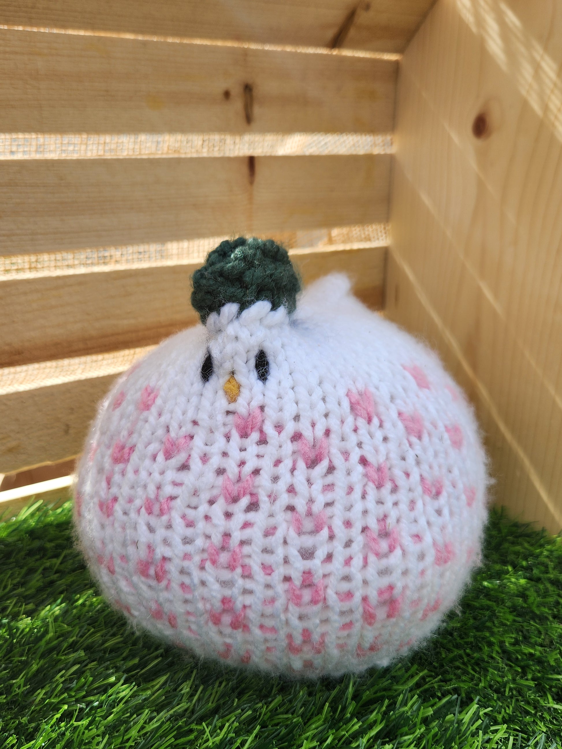 This hand knit chicken plushie is perfect for adding a touch of whimsy to any room. Its soft, handmade design makes it ideal for cuddling or displaying as a unique piece of decor. Made with care, this chicken is sure to bring joy and charm to any space.