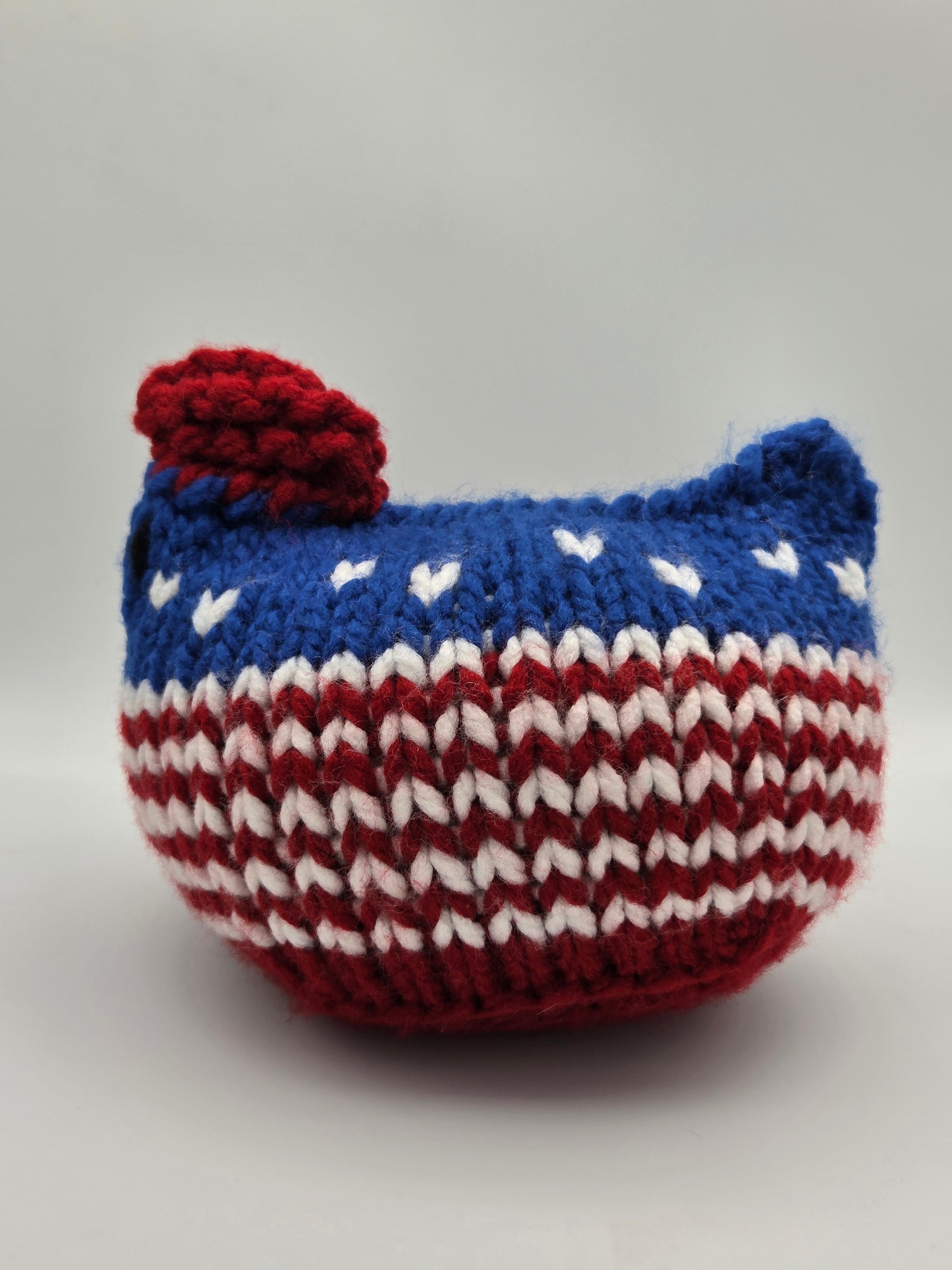 Meet your new feathery friend: a small chicken hand-knit in red, white, and blue! This little clucker is perfect for adding a touch of whimsy to any nook. It won’t lay eggs, but it sure will yolk around and crack you up (pun intended)! Get ready for some serious poultry charm!